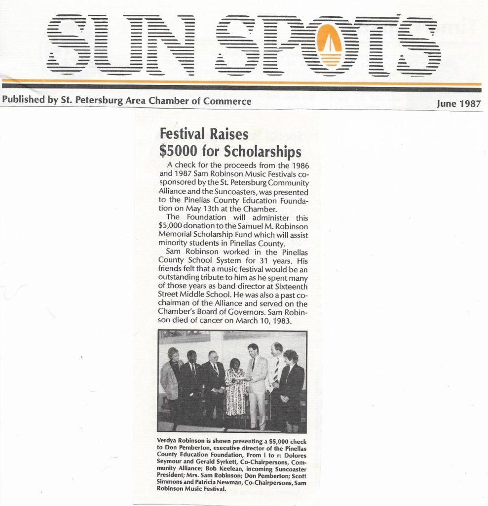 In 1986, the Suncoasters agreed to add the Sam Robison Music Festival to the slate of events for the Festival of States. We started small, just one night with the help of Chris Styles, but in our second year featured the “Crusaders” with Joe Sample and Wilton Felder. The proceeds from the 1986 and 1987 Sam Robinson Music Festivals raised $5,000 for scholarships in Sam’s honor.
