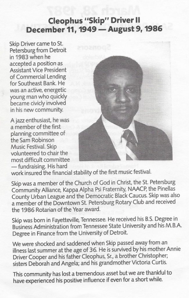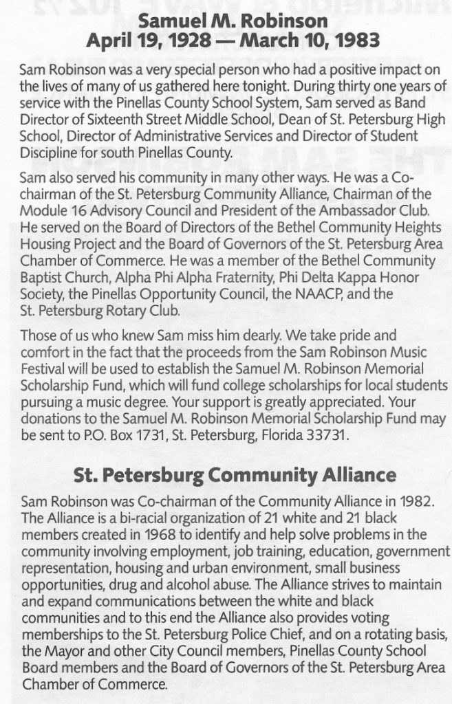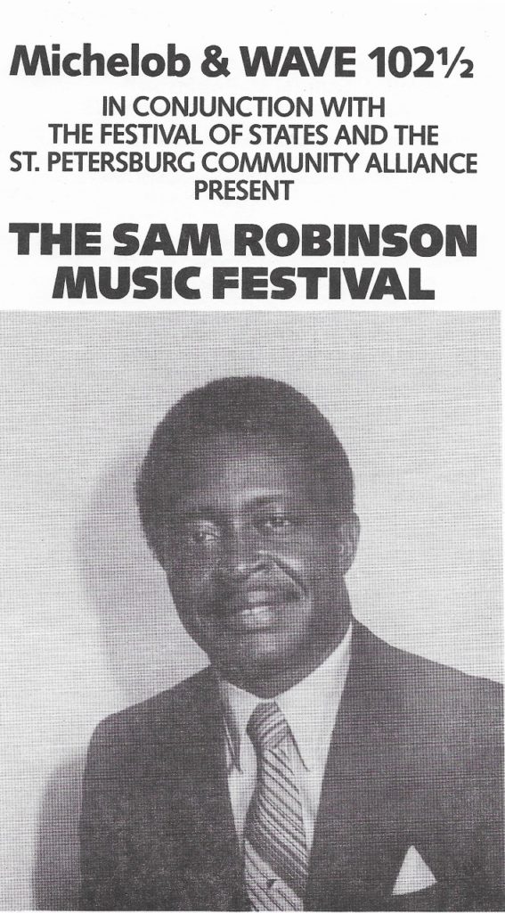 SAM ROBINSON MUSIC FESTIVAL (#93) I am going to take a few days off to make a final edit of my John Prine Documentary, so I thought I would end for now with another story about music. Sam Robinson was Director of Student Discipline for the Pinellas County School System, but got his as a band director. I met Sam through the St. Petersburg Community Alliance and the Suncoasters. Sam died in 1983 and I kept pushing for a music festival named in his honor.