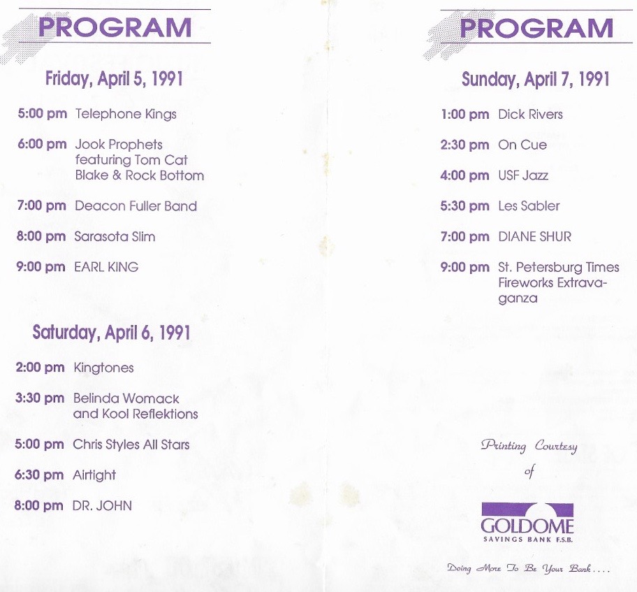 One story I have to share is “The Audience.” All of the Music Festivals were held in Straub Park on the waterfront. I wanted to have a night on the south side of town, near where Sam had started as a teacher. In 1997 we we had a Picnic in Campbell Park on Friday night, sponsored by the Festival of States and the Community Alliance. The music included pianist Al Downing, a Tampa Bay Jazz legend, and as I discovered in my research, one of the original Tuskegee Airman. The Saturday night show in Straub Park featured Billy Preston.